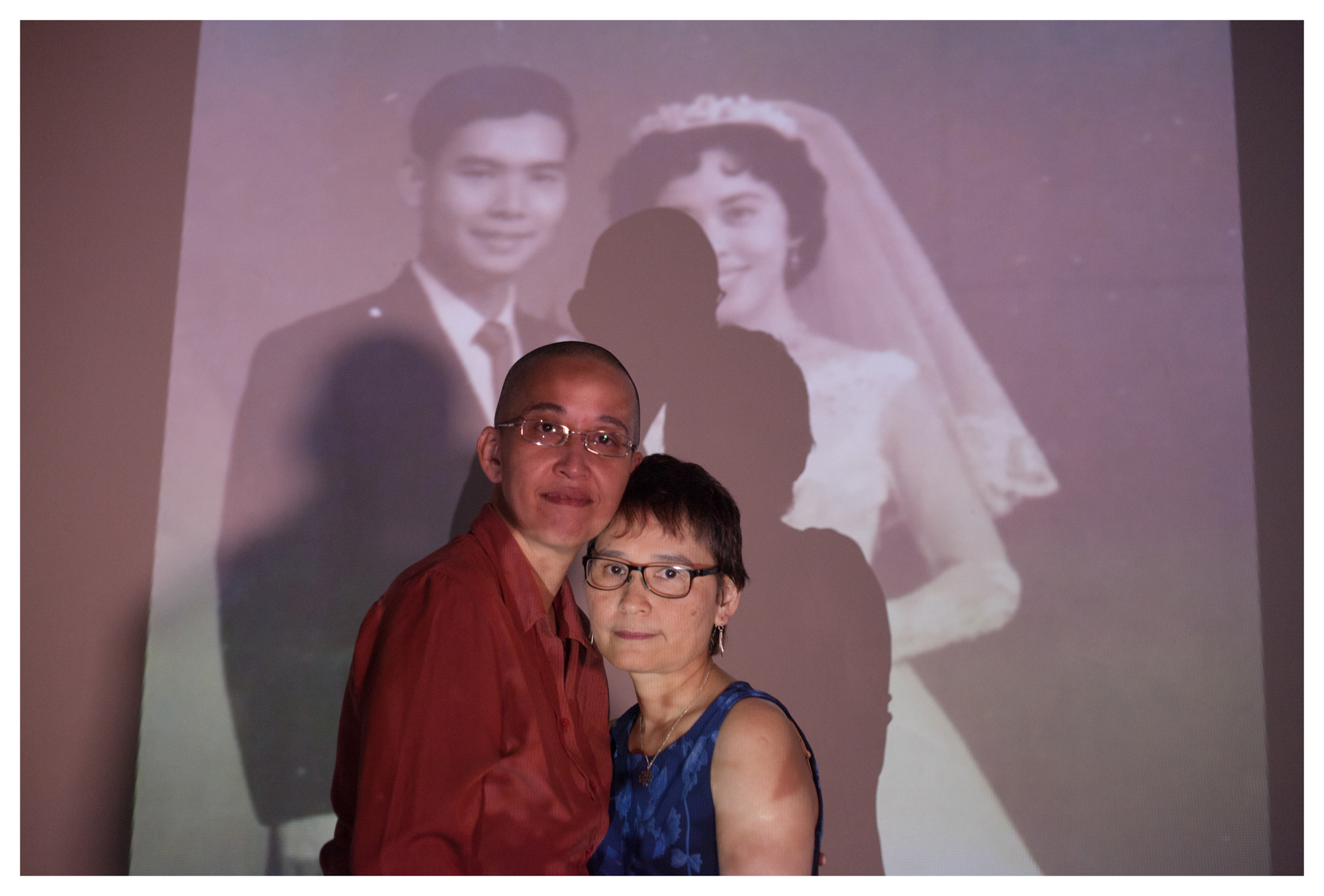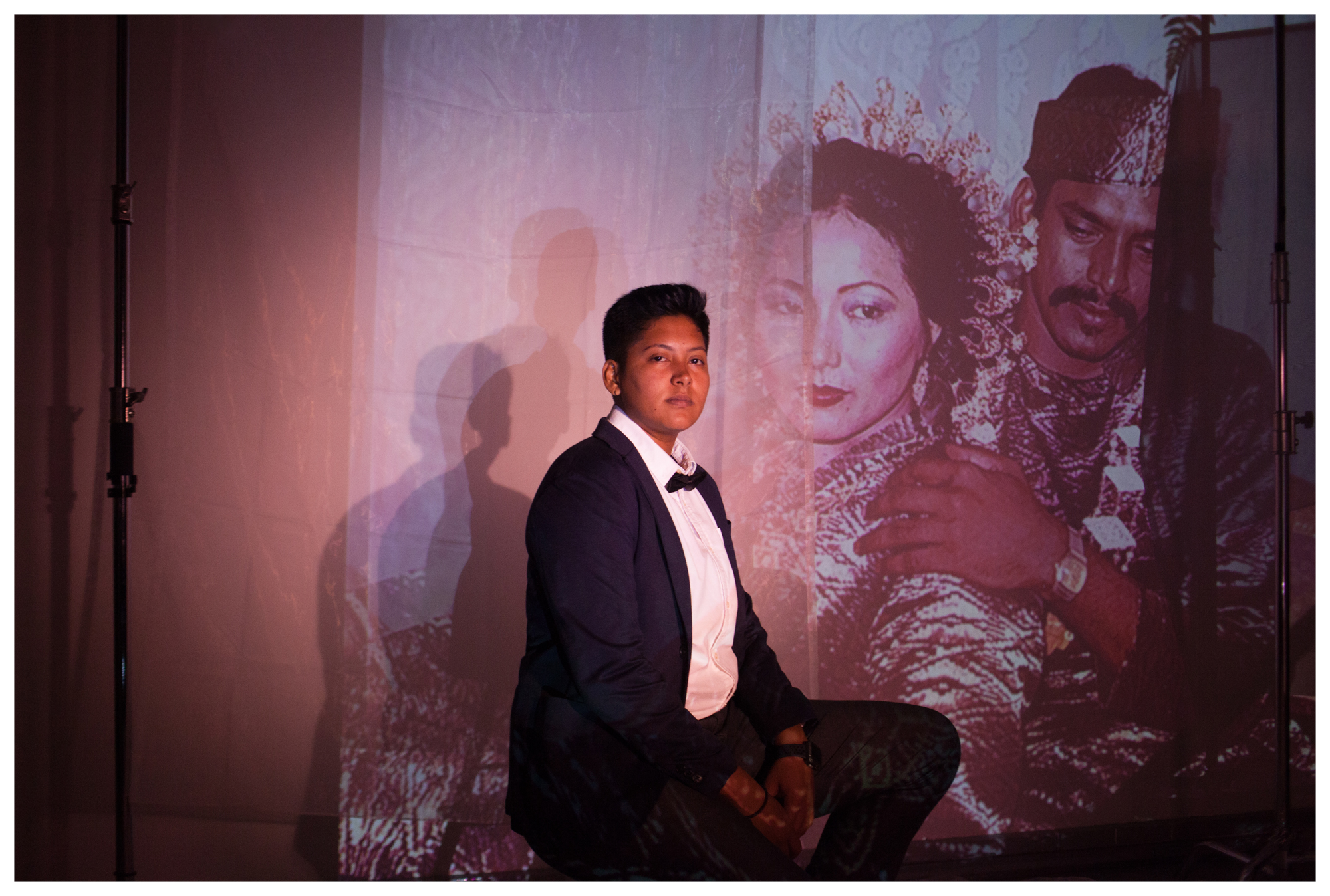 Central to the research is the notion of performativity, both relating to the tension with the camera as well as the everyday self-actualisation process. Brought into a studio and given an array of wedding props and costumes to choose from, the participants interact with matrimonial tropes and constructed gender roles, resulting in images which align with their vision of self-representation. Projected onto the backdrop are their parents’ wedding portraits, a visual reminder of the heteronormative histories that have shaped many LGBTQ people’s lives, and a juxtaposition to the possibilities they are in the midst of creating. Through the use of the set, as well as the use of dramaturgy in the direction of their portraits, participants confront the way they perform their gendered identities in the everyday.