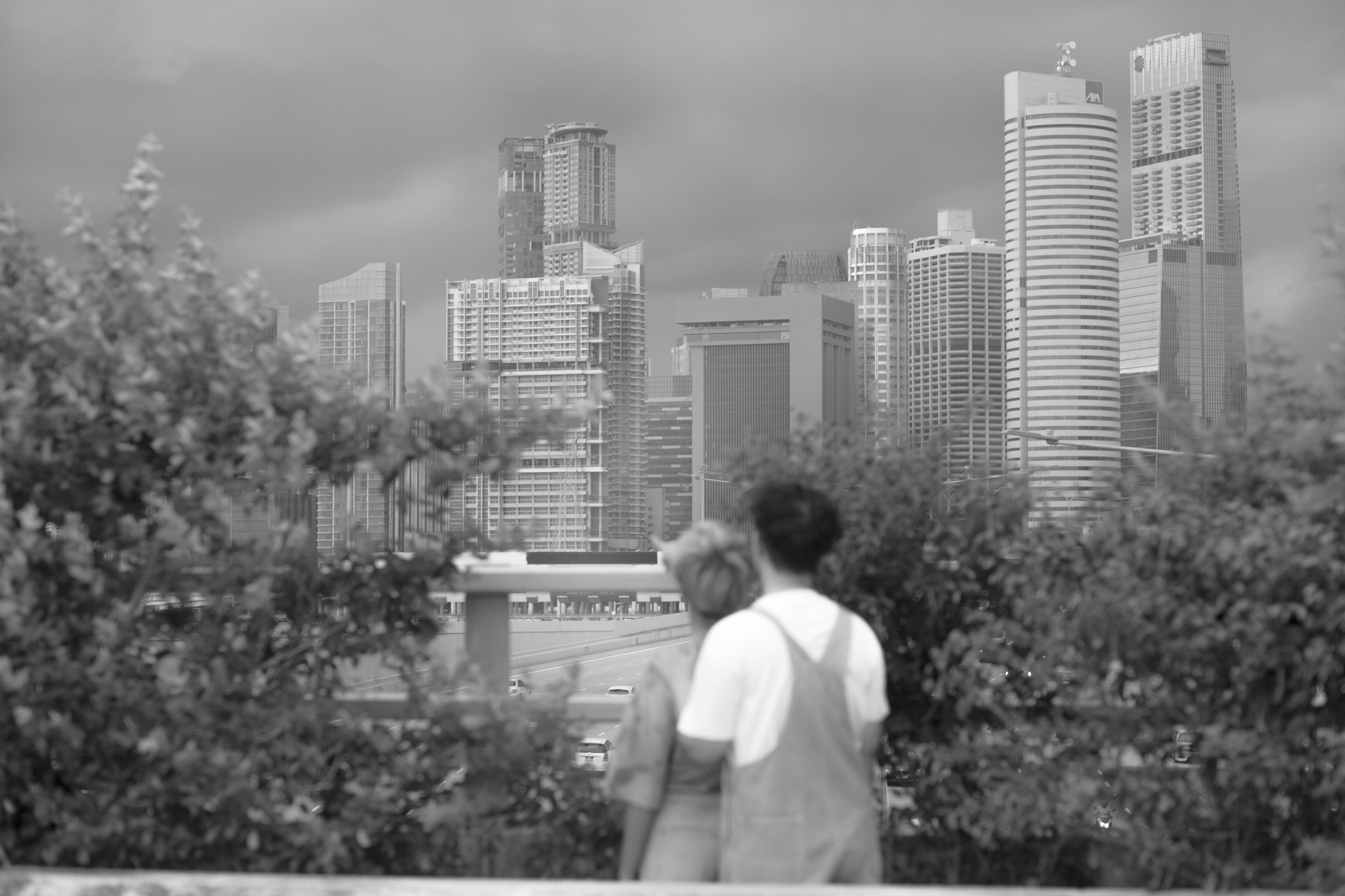 The Two is a series of black and white images using fictive play as a method of examining architecture and the environment. Following an anonymous duo as they explore an alien landscape, the images cast Singapore as a surreal backdrop against which these beings step foot into and move in a curious wonderment. Devoid of colour and of recognizable faces, the series sets a focus on the shapes, lines, and textures of the built environment, lensing the city as a simultaneously familiar and foreign object in and of itself, a sentiment not uncommon considering the pace of change and the speculative potential of the directions the city-state is headedi n. Central to the sequence is the way the duo manages to contain their own private world through the intimacy of their companionship, a nod to everyday instinctive gestures of creating belonging in space.